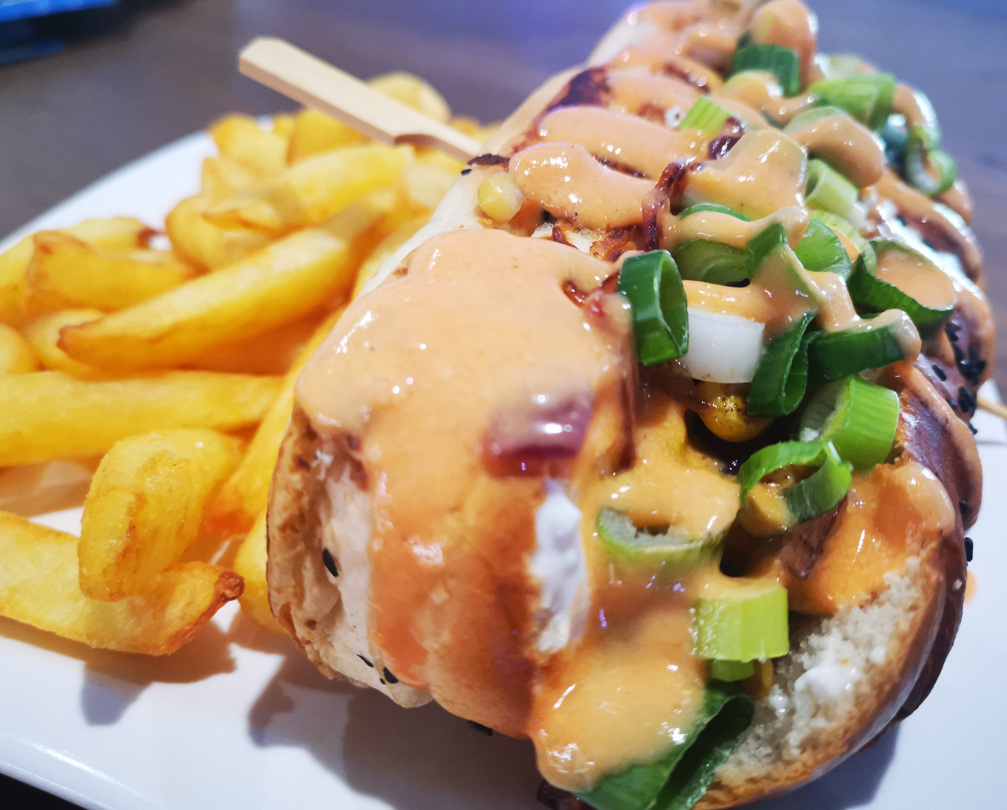 540g, žemľa, majonéza, zelenina - ľadový šalát, coleslaw, bravčové trhané mäso, hranolky, BBQ omáčka -