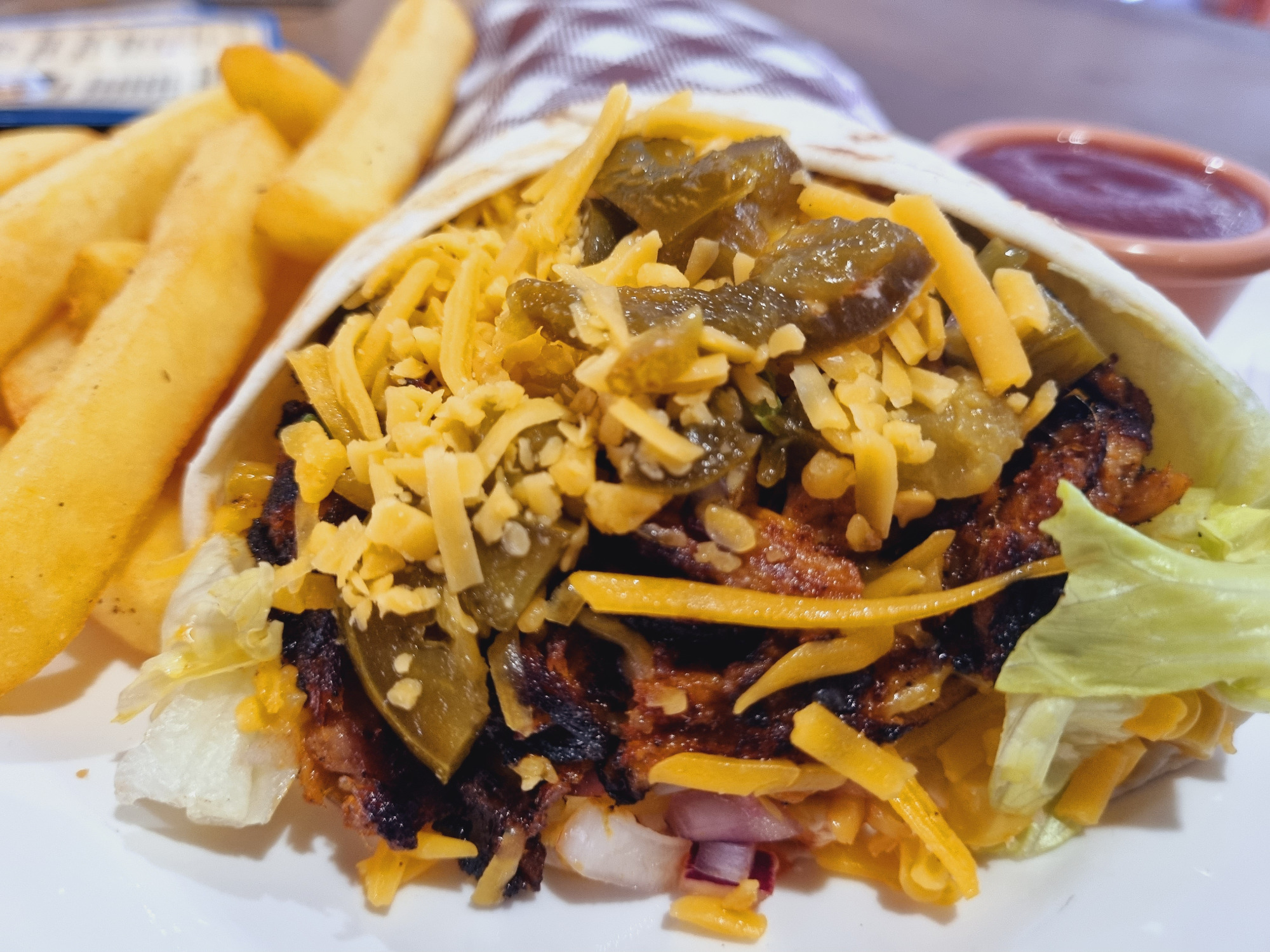 590g, tortilla, majonéza, BBQ omáčka, zelenina - ľadový šalát, kukurica, červená cibuľa, bravčové trhané mäso, strúhaný syr Cheddar, hranolky, BBQ omáčka