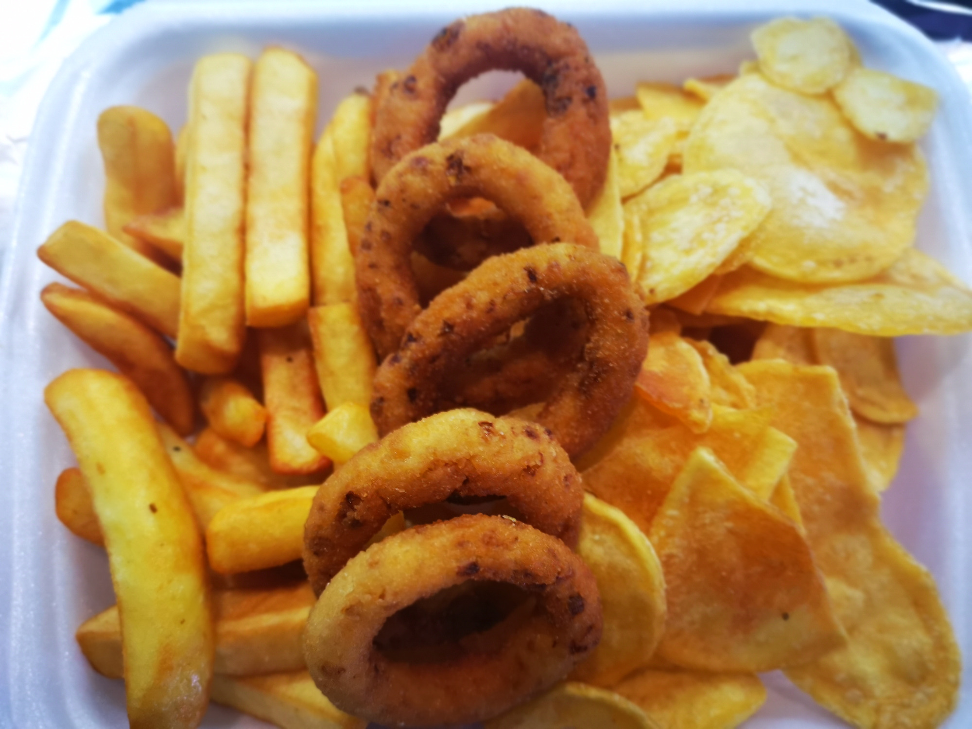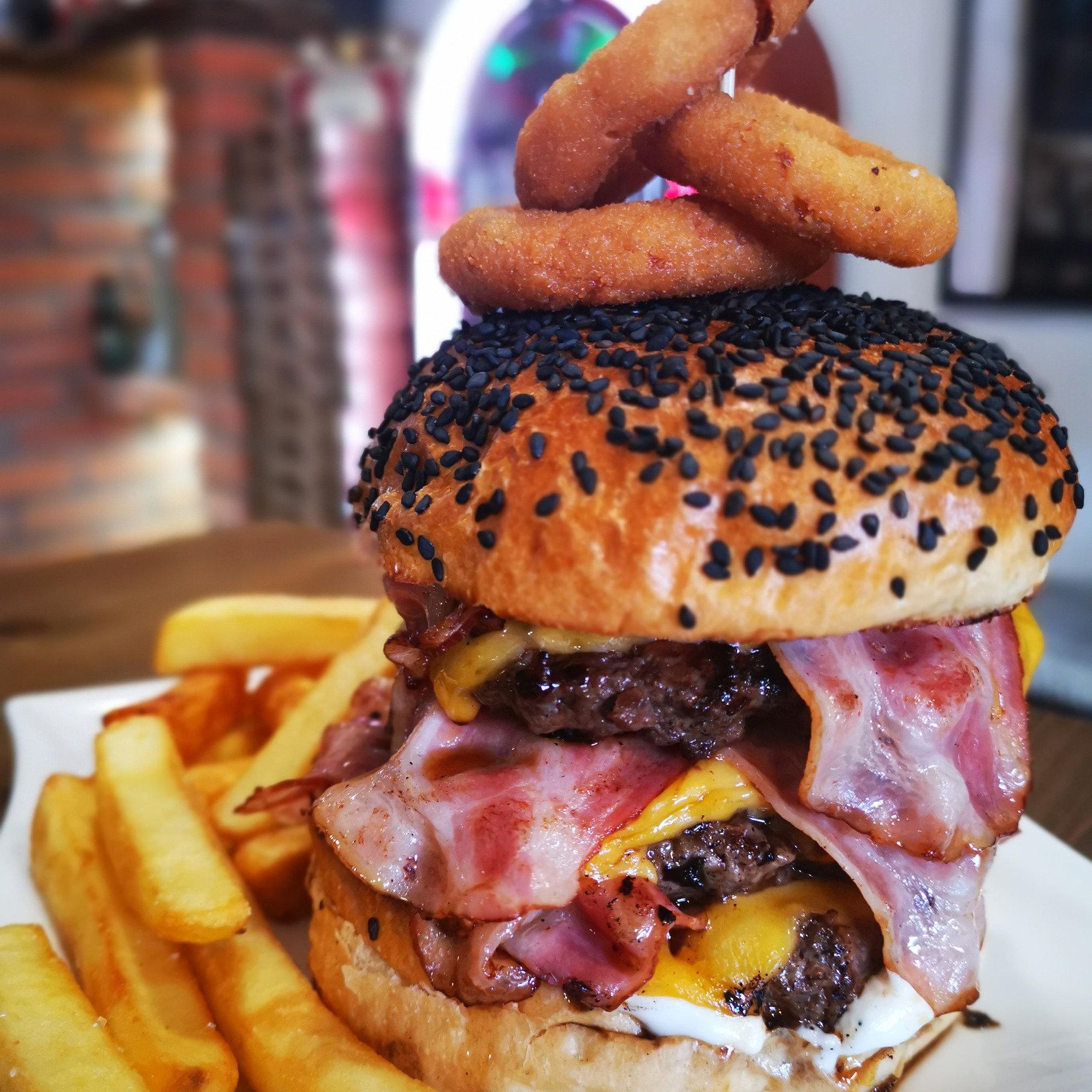 majonéza, rajčiny, hovädzie mäso, oštiepok, 2x anglická slanina, volské oko a karamelizovaná cibuľka, hranolky a 3 ks cibuľové krúžky, BBQ omáčka