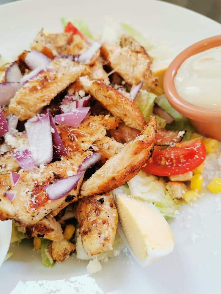 420g, zelenina - ľadový šalát, cherry rajčiny, kukurica, kuracie mäso, slanina, krutóny, vajce, syr Parmezán, ranch omáčka