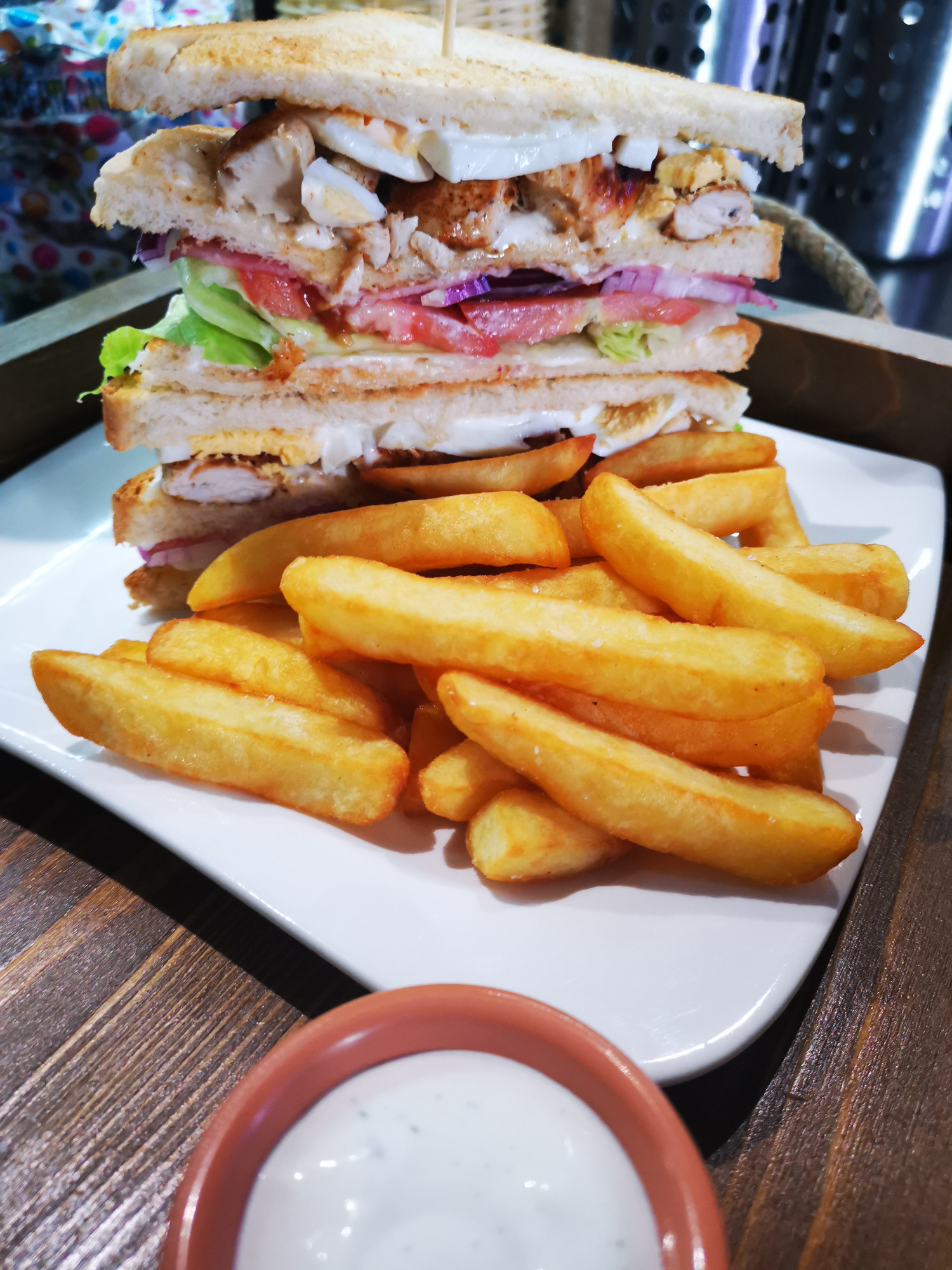 540g, 3x sendvič, majonéza, zelenina - ľadový šalát, rajčiny, červená cibuľa, kuracie mäso, 2x slanina, vajce, hranolky, ranch omáčka