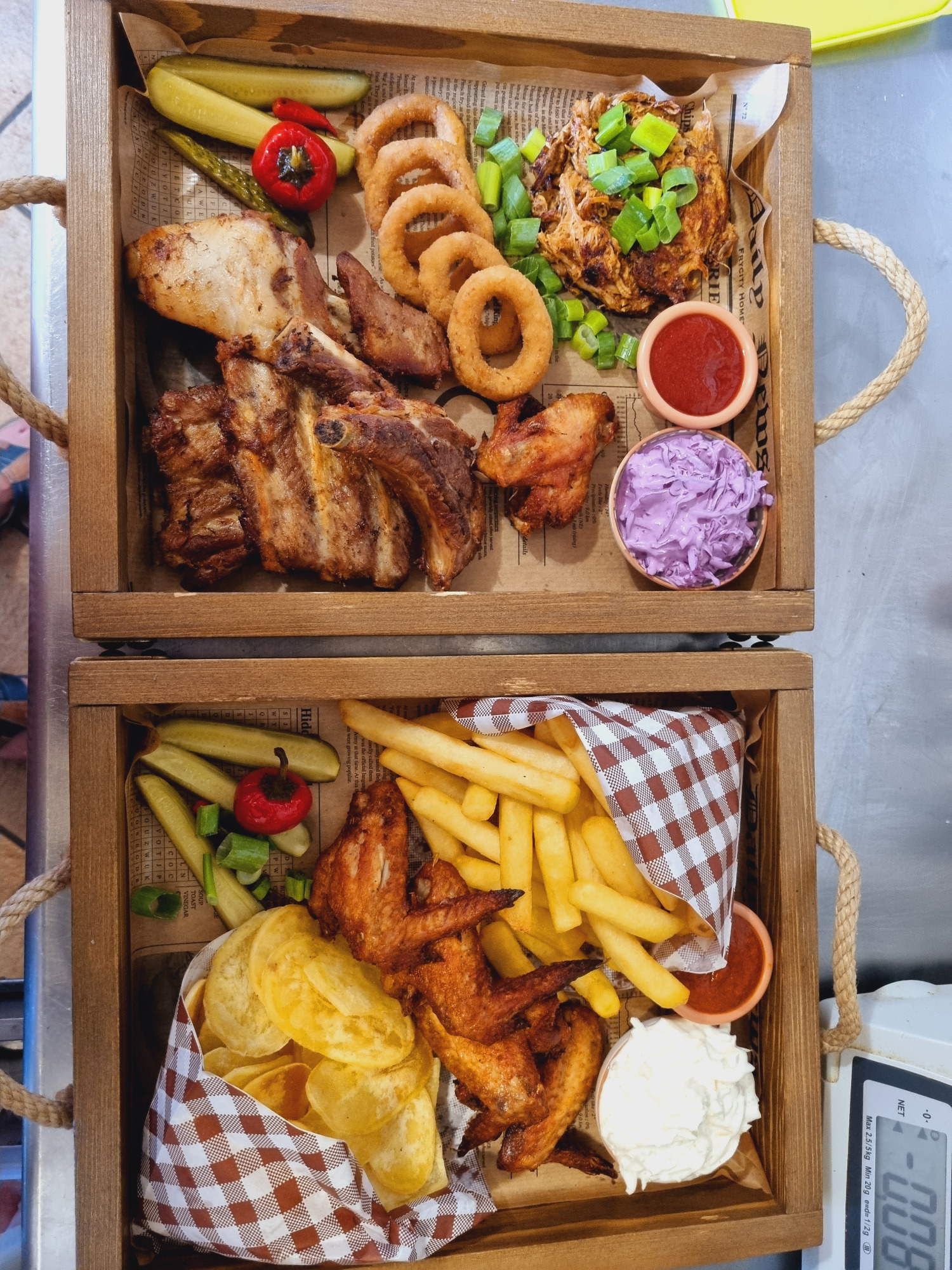 820g, žemľa, majonéza, zelenina - ľadový šalát, rajčina, hovädzie mäso, kuracie mäso, bravčové trhané mäso, 2x syr Cheddar, 2x slanina, strúhaný syr Cheddar, hranolky, BBQ omáčka -